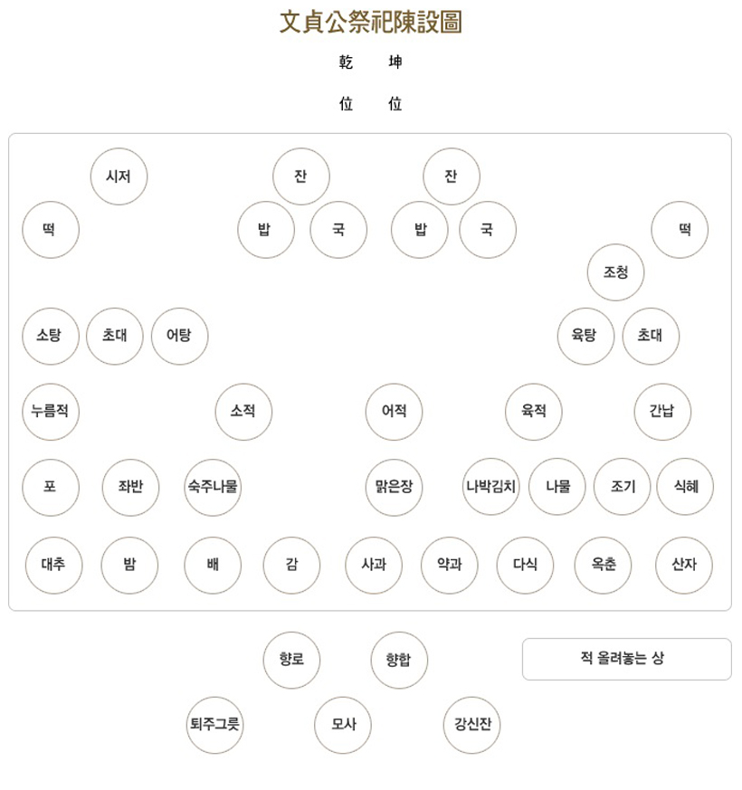 먼저 잔을 올리고 다음 시저 다음 실과 포와식혜 다음 나물 맑은간장 다음 누름적 간납 다음 탕(소,어,육,삼탕) 다음 국수와떡 다음 밥과국 다음 적(소,어,육적)예 차례로 진설함 어물측은 머리가 서쪽(왼쪽)으로 가게 진설한다.